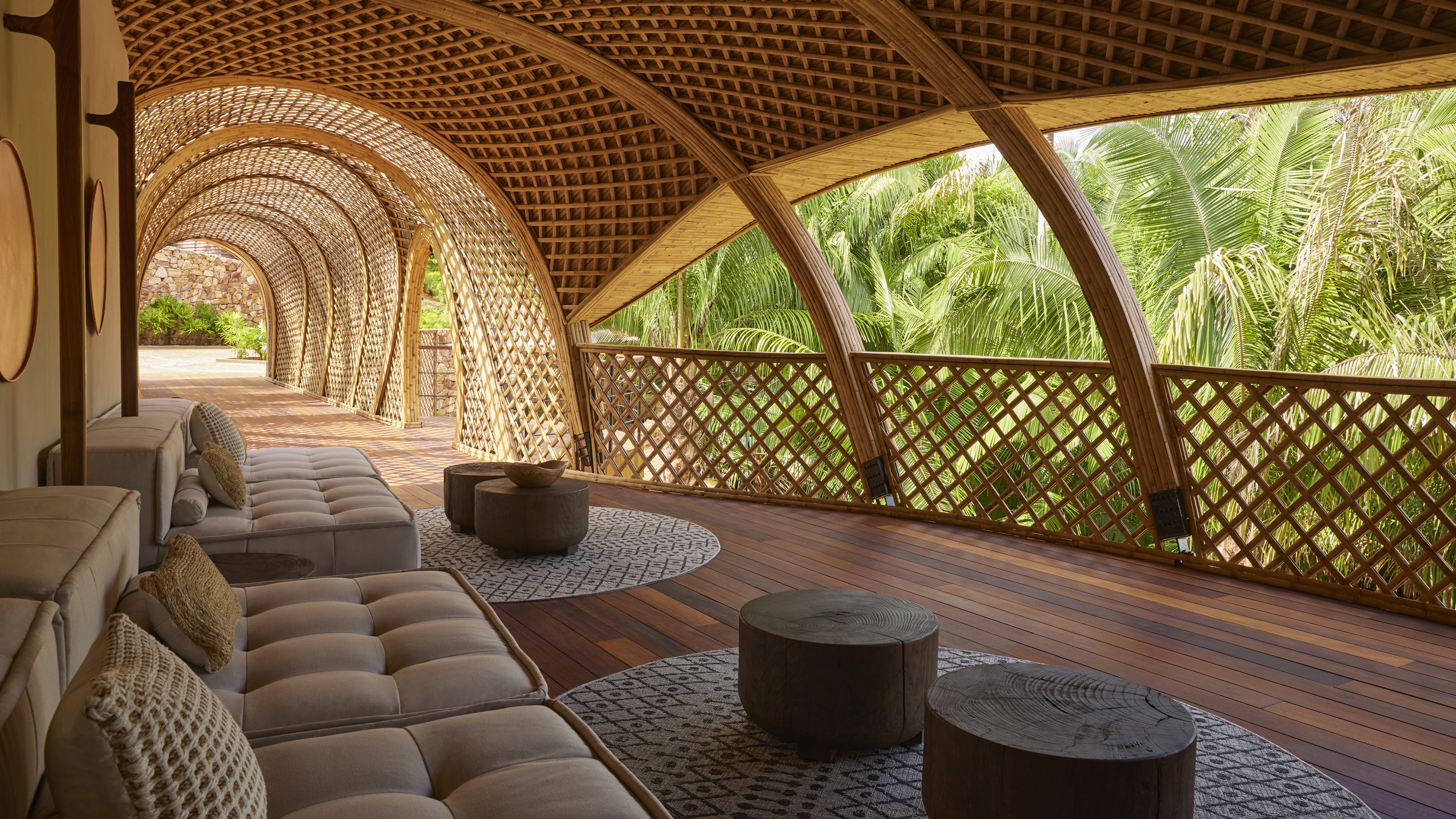 Luxury Frontiers designed the 15 tented bungalows as a study in biophilic architecture, with canvas roll-up walls that open the living areas directly to the jungle and bespoke furniture fabricated by local artisans. The site design team (EDSA) surveyed the 48-acre peninsula tree by tree and hand-placed the tents between roughly 1,800 preserved specimens, with another 345 natives added after construction. Materials run to laminated bamboo, copper, and indigenous stone. The arrival sequence (a timber footbridge wrapped in a lattice bamboo weave, opening into a copper-shingle cocoon) is one of the most controlled welcome experiences in any Mexican resort. Adults only (16+), 15 tents, operationally independent of its larger Four Seasons neighbor next door.