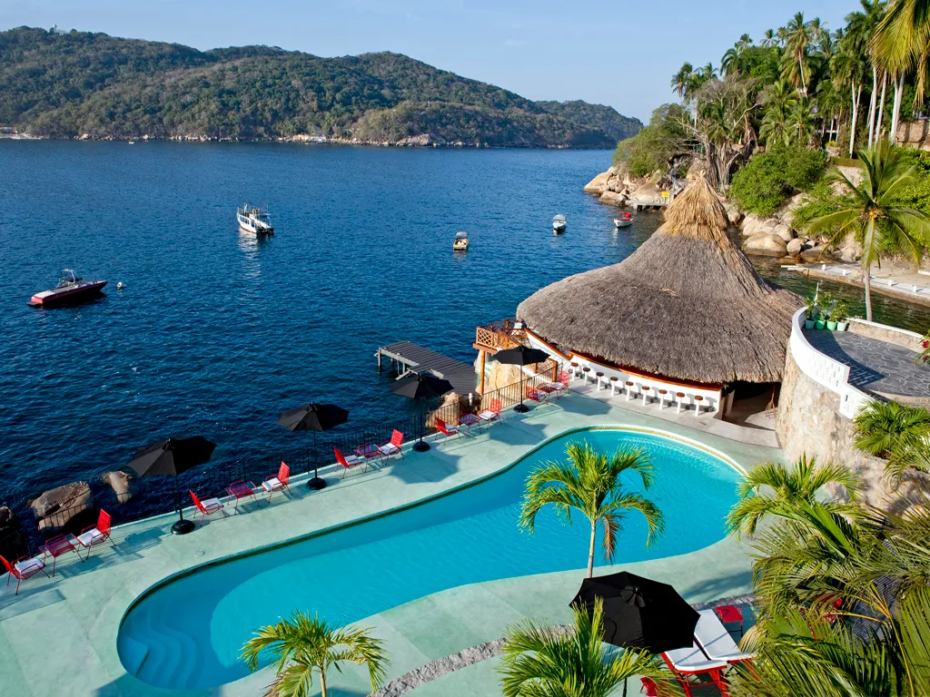 A 1950s mid-century modernist time capsule restored by Grupo Habita in 2010, sitting on a small rocky point in Caleta Bay. 30 rooms, white walls, Acapulco yellow and turquoise accents, the original diving platform from the Jet Set era still in use. The architecture is the point: it's one of the last functioning examples of the Golden Age Acapulco vocabulary (angular concrete, open-air everything, a pool cantilevered over the rocks) and the restoration respected the original fabric rather than updating it out of existence. If you care about mid-century Mexican design, Boca Chica is a pilgrimage site.