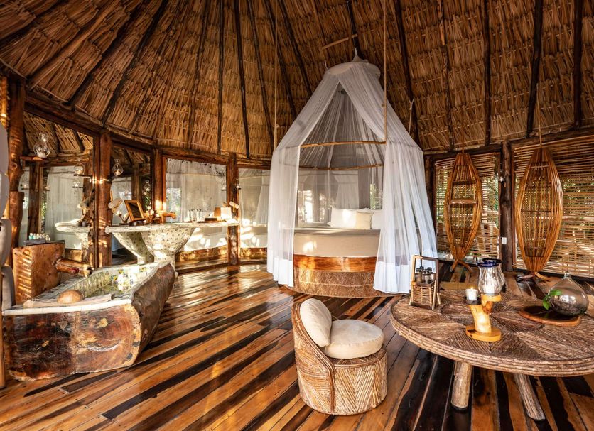 Eduardo Neira (known as Roth) spent two decades building a jungle compound that reads somewhere between Gaudi and a tree-dwelling primate's dream. Curving bejuco-vine structures, no straight lines, suspended wooden walkways, Mayan and organic references, rooms with no electricity and sunken stone tubs. The architecture is polarizing (some love it, some find the bare floors and deliberate discomfort too much), but nobody denies it's architecture. Included here because the form is genuinely unlike anything else in Mexico and because it's been the single most-photographed hotel interior on the Yucatan peninsula for 10 years running.