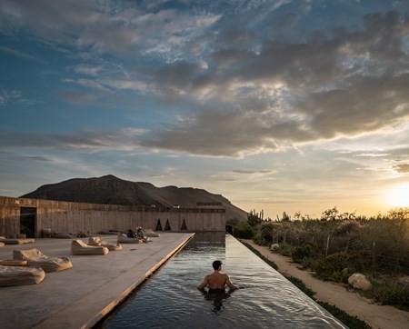 A compact 19-room boutique in downtown San Jose, concrete-forward in the same register as Paradero but at a smaller scale. Built around an interior courtyard with a pool and mature trees, with ground-floor public spaces that open directly to the plaza. The architecture is urban rather than resort, which matters in Cabo because almost nothing else in the region is. The property also carries a very specific vibe (art, mezcal, music) that the architecture amplifies.